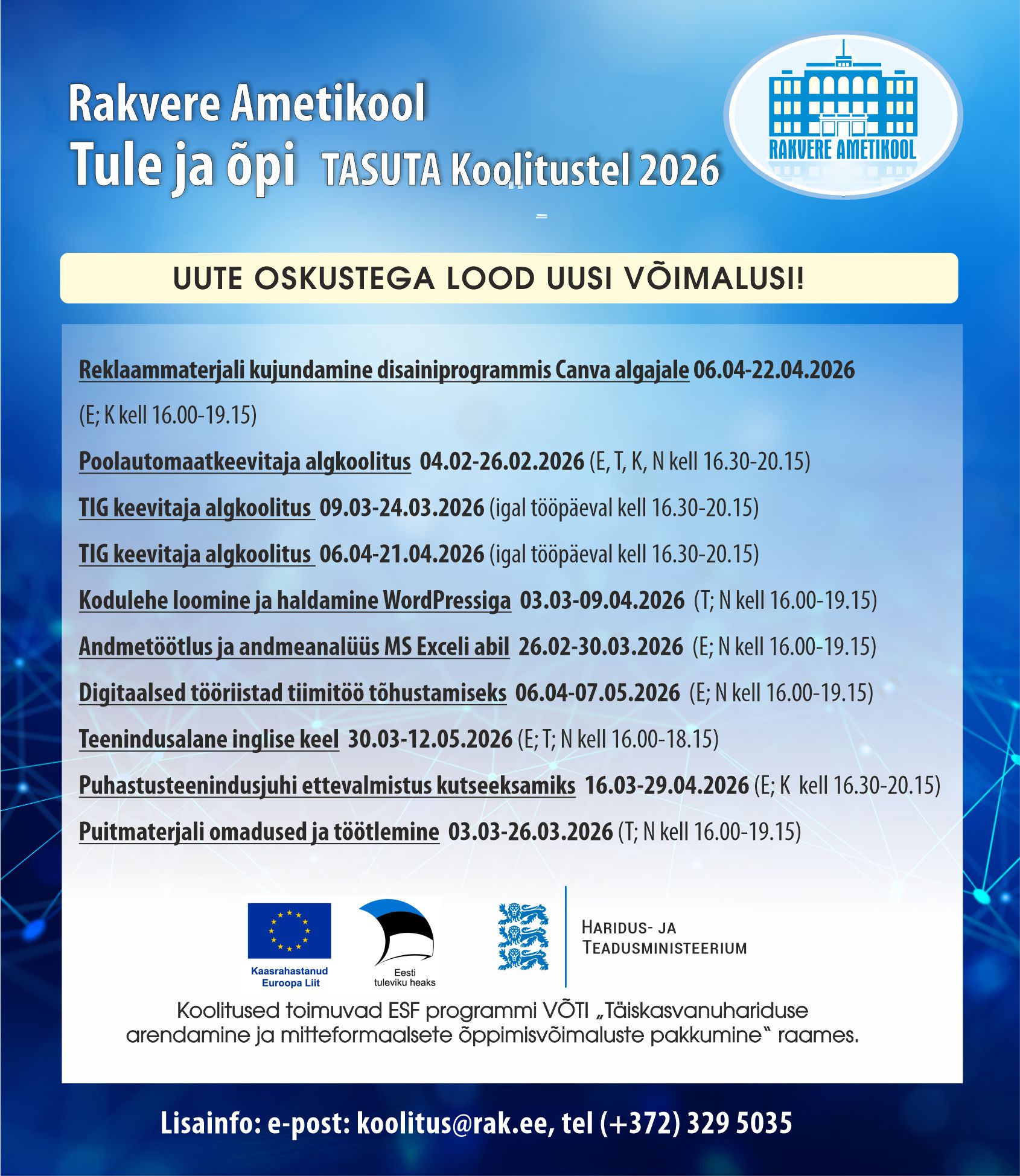 Rakvere Ametikool pakub tasuta koolitusi – praktilised, ajakohased ja kohe rakendatavad.