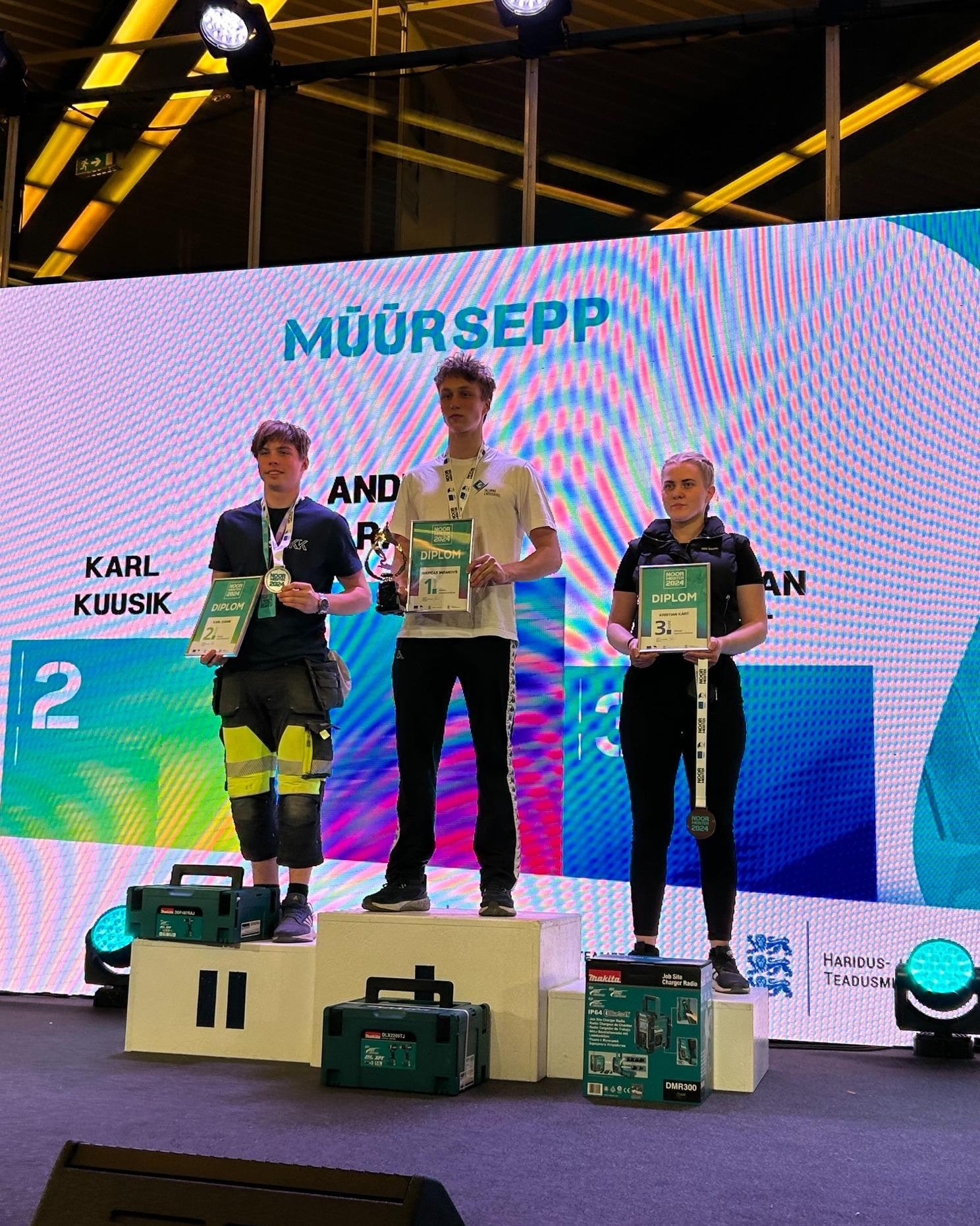Järgmisel päeval olid meil võistlustules veel kuue eriala noored, kes võistlesid müürsepa, ehituspuusepa, ehitusviimistleja, restoraniteenindaja, koka ja laotöötaja erialadel. Meie laotöötaja eriala õpilased Martin Tolk ja Kevin Põldver saavutasid kaksikvõidu. 1. koha saavutas Martin ja 2. kohale tuli Kevin. Nende juhendajaks oli Andrei Koplik, palju õnne! Lisaks sellele saavutas poodiumiväärilise tulemuse meie müürsepa eriala õpilane Kristjan Kärt, kes saavutas 3. koha! Kristjani juhendajaks oli Marijanna Tasa, palju õnne!